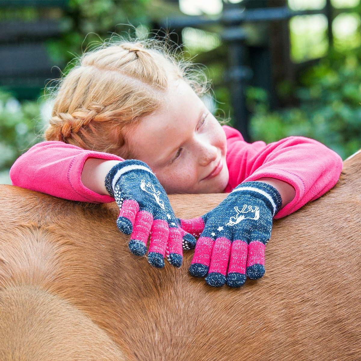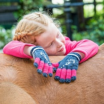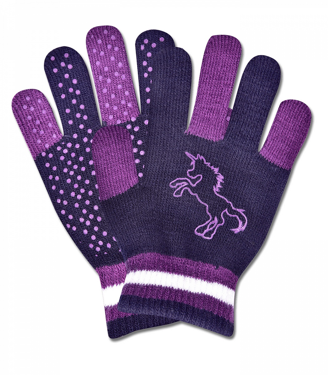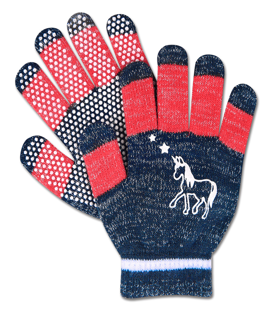 Детские вязаные перчатки с эластичными манжетами и силиконовым покрытием на ладошках. Перчатки украшены веселым изображением единорога и контрастными полосками.Нет в наличии, ожидается поступление.
