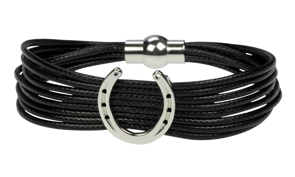 Браслет в виде черных плетеных шнурков, украшенный серебристой подковой. Оснащен надежной магнитной застежкой.Нет в наличии, ожидается поступление.