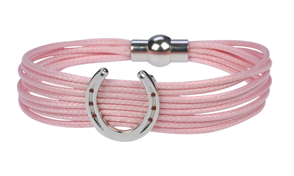 Браслет в виде розовых плетеных шнурков, украшенный серебристой подковой. Оснащен надежной магнитной застежкой.Нет в наличии, ожидается поступление.