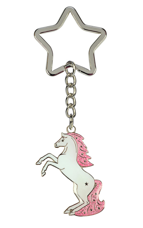 Красивый детский брелок в виде гарцующей лошадки со сверкающей розовой гривой и хвостом. Кольцо в виде звездочки прекрасно подойдет для крепления на куртку, рюкзак или ключи. Волшебный подарок для юных любителей лошадей!Нет в наличии, ожидается поступление.