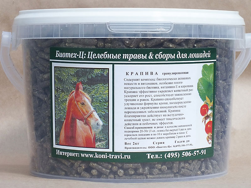 Крапива эффективно укрепляет копытный рог, ускоряет его рост, способствует заживлению трещин и ранок. Способствует улучшению формулы крови, выздоровлению лошади и укреплению иммунитета после перенесенных заболеваний. Благоприятно действует на желудочно-кишечный тракт. Содержит комплекс биологически активных веществ и витаминов, в том числе биотин и каротин (по содержанию каротина крапива превосходит морковь, и свежую, и сушеную). В народной медицине крапива включена в состав многих лечебных сборов: противоревматических, суставных, противоаллергических. Белки крапивы содержат много лизина и метионина. Крапива в рекомендованных дозах не имеет токсического действия и противопоказаний.Нет в наличии, ожидается поступление.