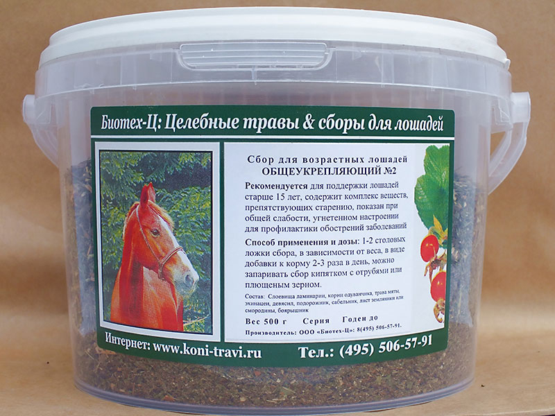 Общеукрепляющий травяной сбор с ламинарией. Насыщен микроэлементами и биологически-активными веществами, которые нужны пожилым лошадям, нормализует обмен веществ, улучшают состояние суставов и связок, повышает усвоение фосфора, кальция и железа, укрепляет сердечную мышцу и повышает иммунитет. Показан для профилактики обострений возрастных заболеваний и старых травм у лошадей, общей слабости, нарушениях пищеварения, вялости, апатии.Нет в наличии, ожидается поступление.