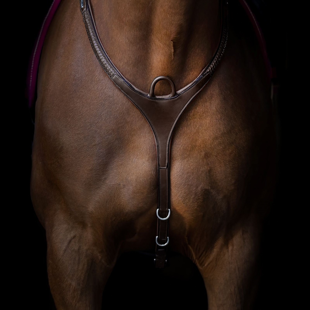 Трехточечное подперсье в классическом стиле. Служит дополнительной поддержкой седла, не давая ему сползать назад. Два колечка для крепления дополнительного снаряжения, эластичные вставки для максимального комфорта вашей лошади, удобный карабин для крепления к подпруге. Стильное кожаное плетение и фирменная металлическая табличка Utzone.Перед посещением, уточняйте наличие товара в магазине