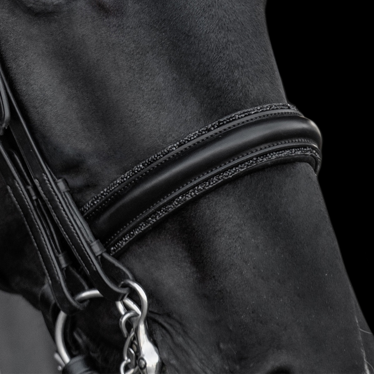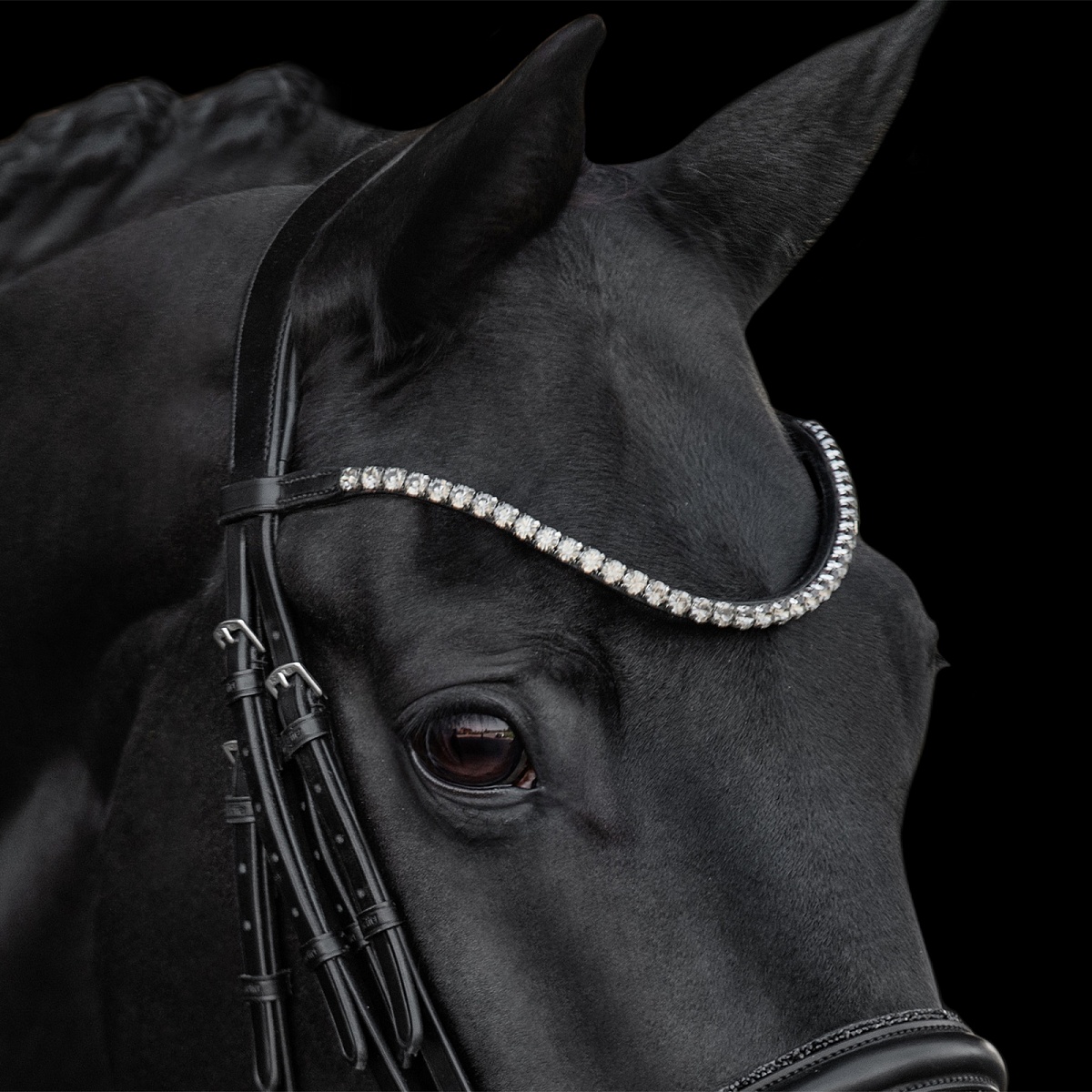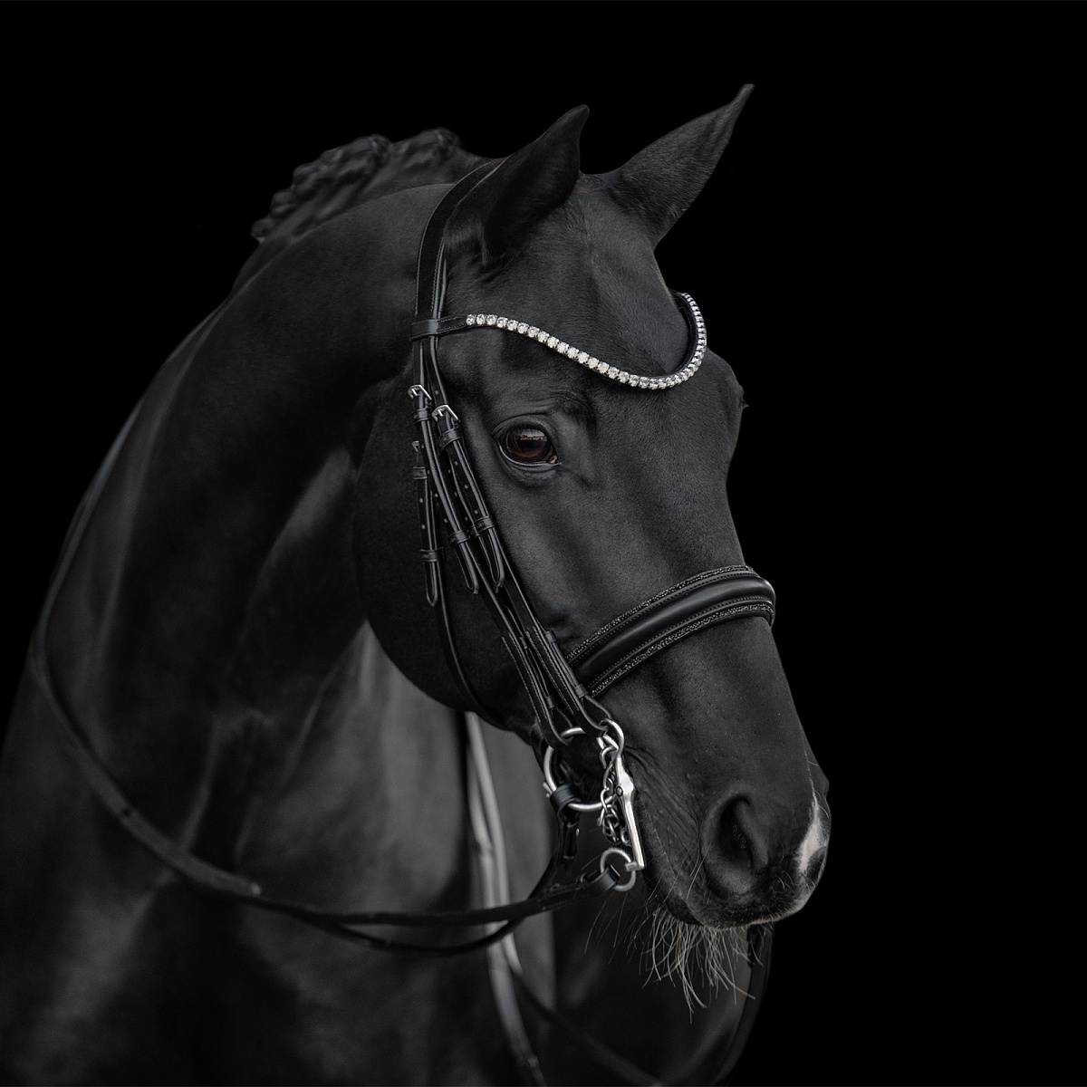 Эффектное оголовье из мягкой кожи с самозатягивающимся капсулем. Анатомический затылочный с вырезами для ушей, элегантный капсуль со сверкающей окантовкой из темных кристаллов, изогнутый налобный ремень с крупными камнями из горного хрусталя. Фурнитура хром. Мягкие кожаные поводья в комплекте.| Наименование | Розничный магазин | Интернет-магазин | Кол-во | |