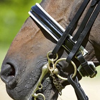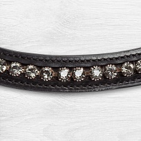 Эффектное классическое оголовье из высококачественной кожи. Оснащено широким самозатягивающимся капсулем (35 мм в размере Cob, 40 или 50 мм в размере Full) с белой мягкой подкладкой и налобным, анатомически изогнутым, ремнем с серыми кристаллами Swarovski. Сбоку логотип Kieffer.Нет в наличии, ожидается поступление.