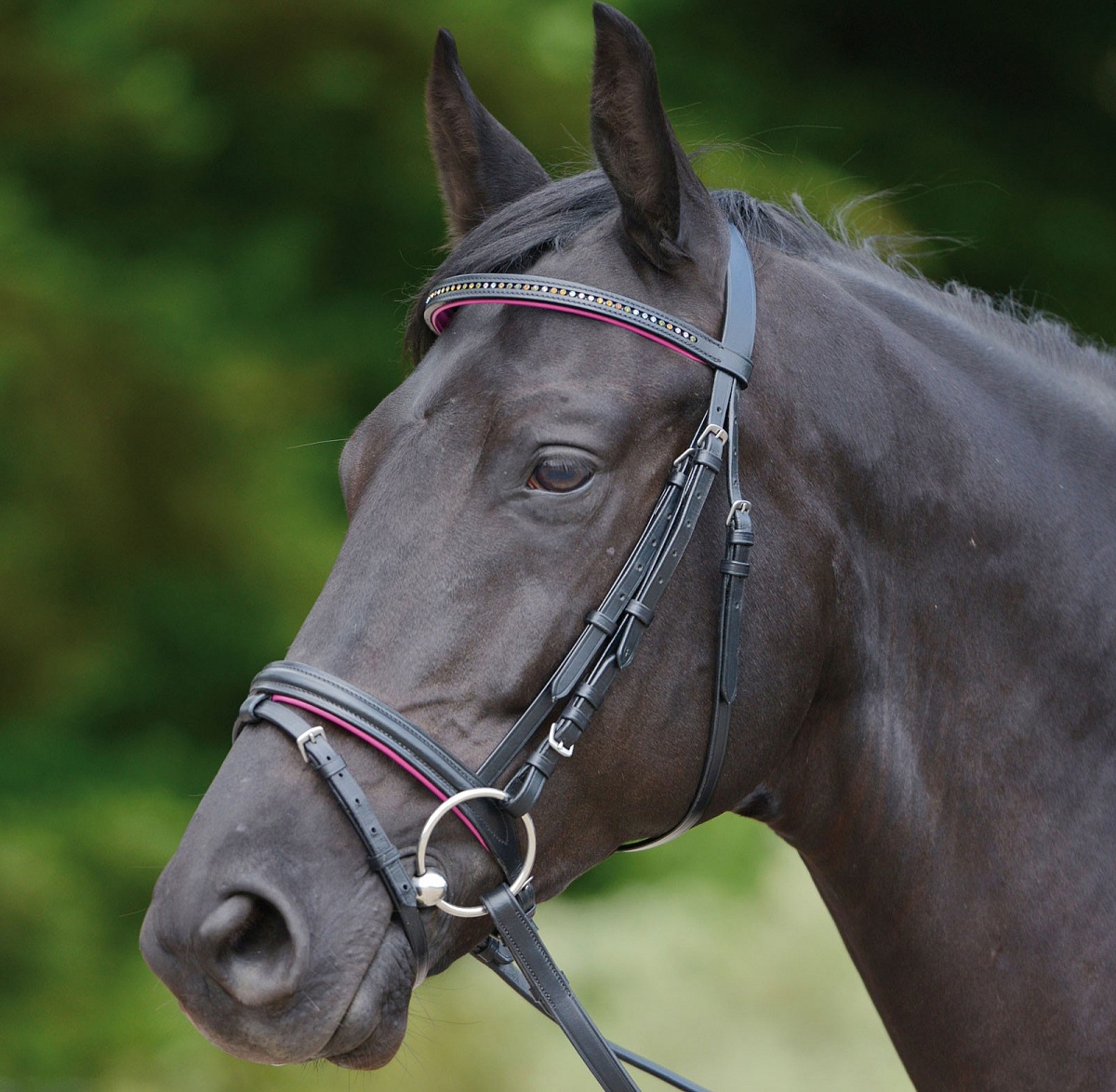 Классическая уздечка из качественной кожи с прочной никелированной фурнитурой, удобным тесьмяным поводом шириной 19мм, плоским подбородным ремнем и восьмеркой. Капсуль и налобный ремень оснащены мягкими подложками ярко-розового цвета. Налобный ремень украшен разноцветными стразами. Классические формы в сочетании с оригинальными деталями.Нет в наличии, ожидается поступление.