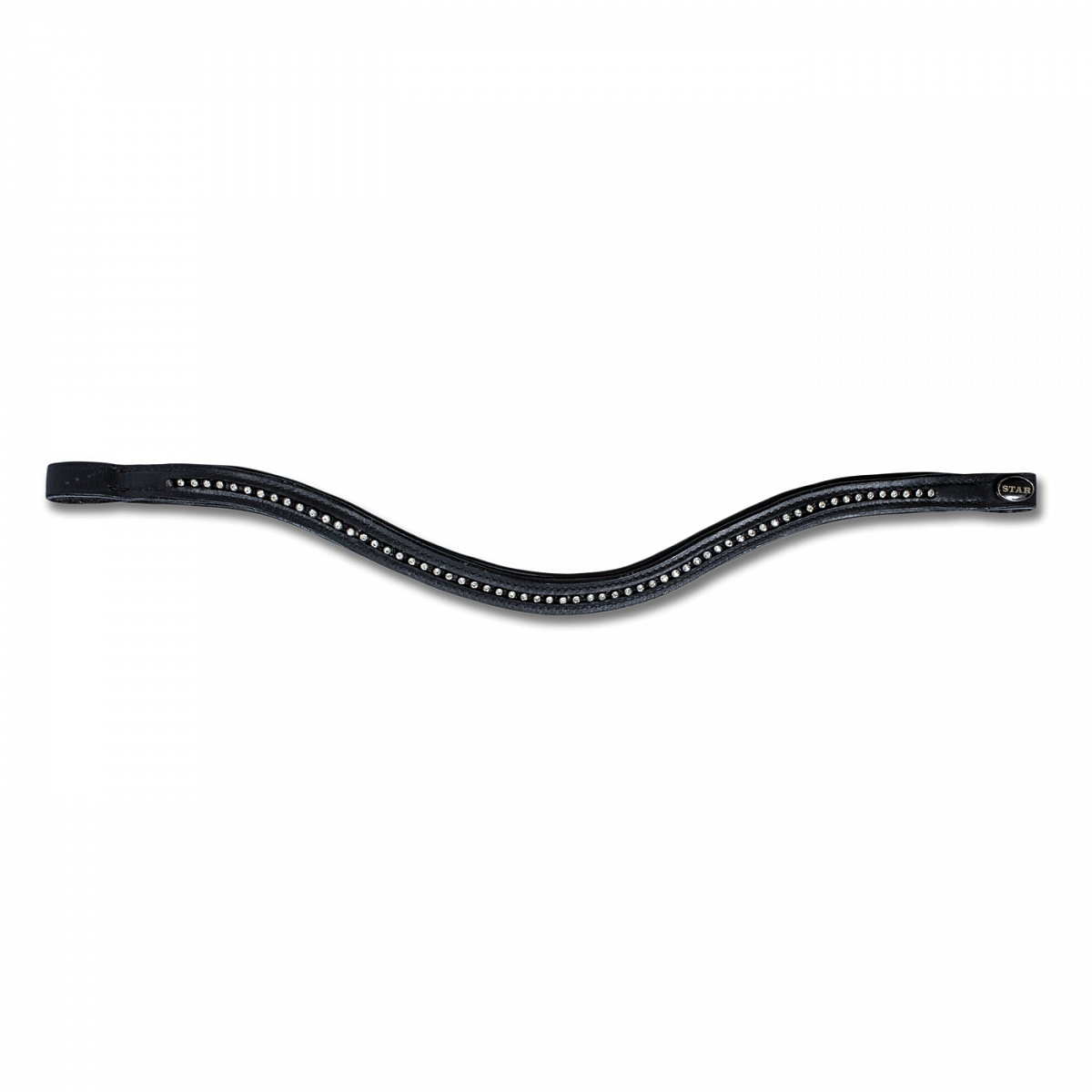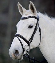 Уздечка из прочной кожи оснащена никелированной фурнитурой, мягкими подкладками на налобном ремне и капсуле, а так же удобными тесьмяными поводьями шириной 19мм. Украшена изогнутым налобным ремнем с белыми камнями. Классический дизайн и отличное соотношение цены и качества.Нет в наличии, ожидается поступление.