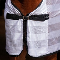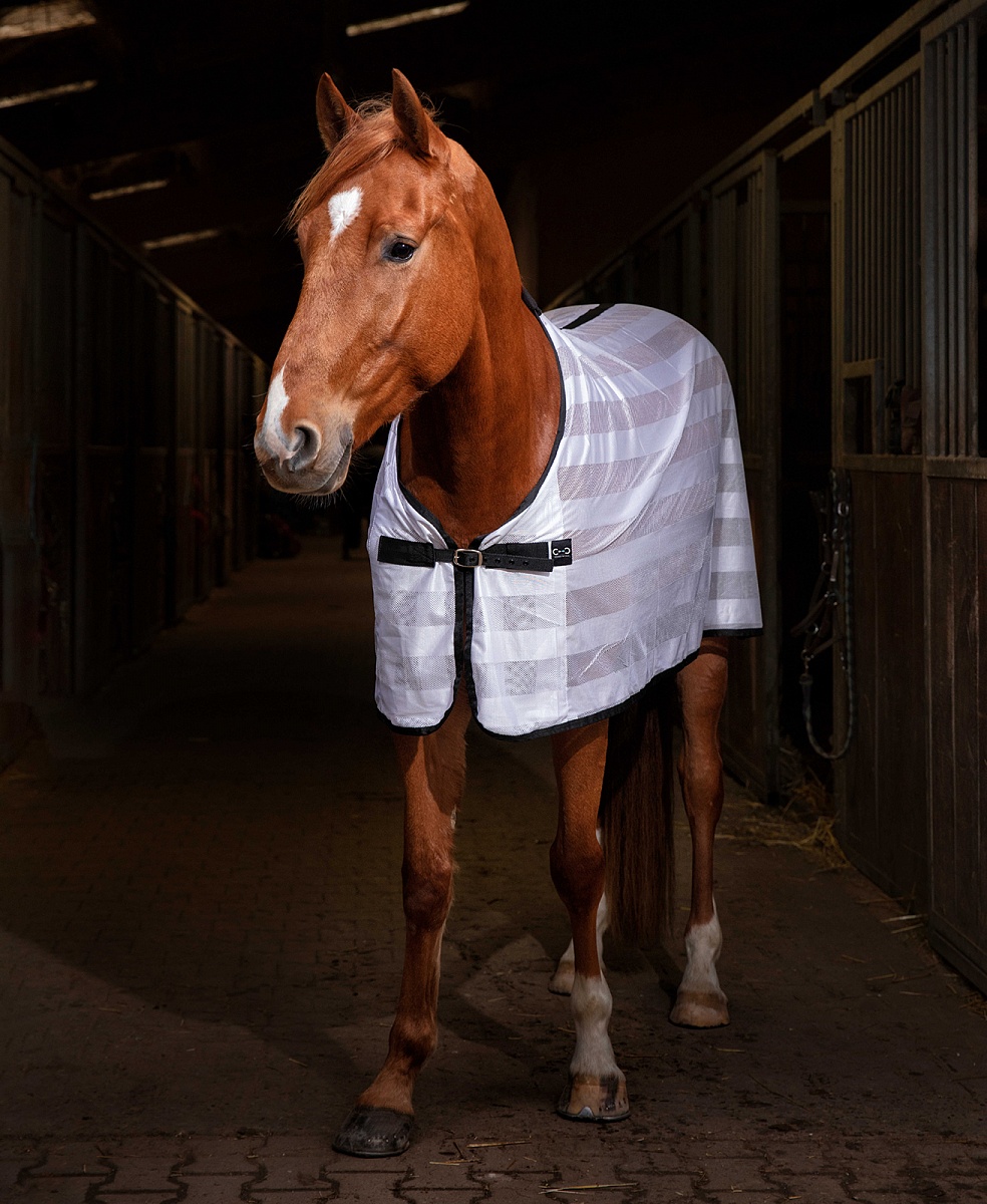 Легкая сетчатая попона для защиты от насекомых. Застежка на груди, красивый узор в полоску и контрастный кант.Нет в наличии, ожидается поступление.