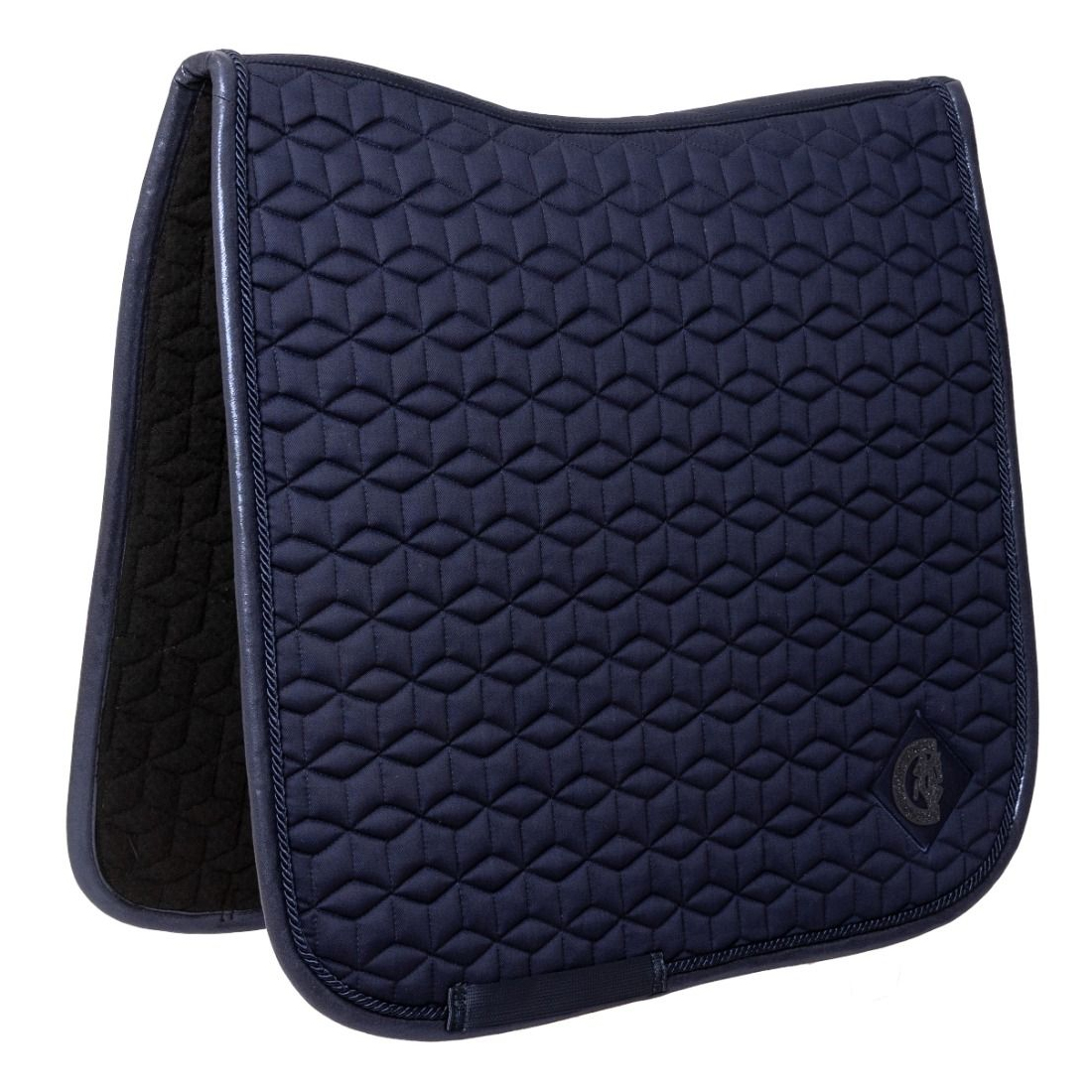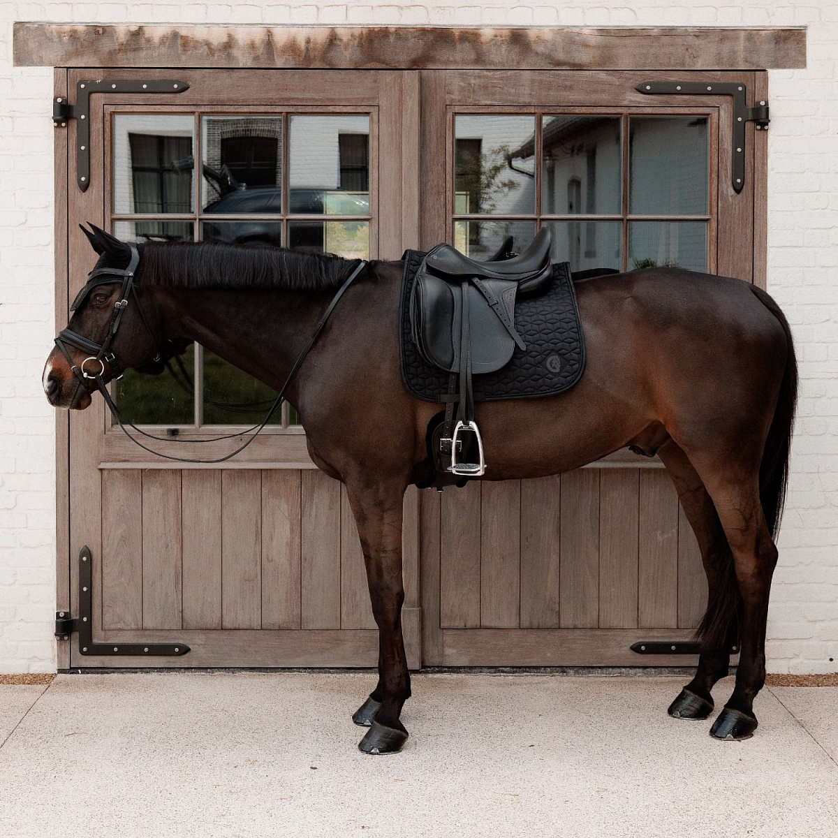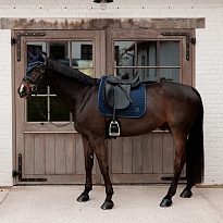 Выездковый вальтрап Kentucky с блестящим кантом. Анатомическая форма освобождает холку от давления и трения, вафельная подкладка из смеси полиэстера с хлопком отлично впитывает пот. Кантик-косичкой, сияющее фирменное лого и оригинальный кант с люрексом.Перед посещением, уточняйте наличие товара в магазине