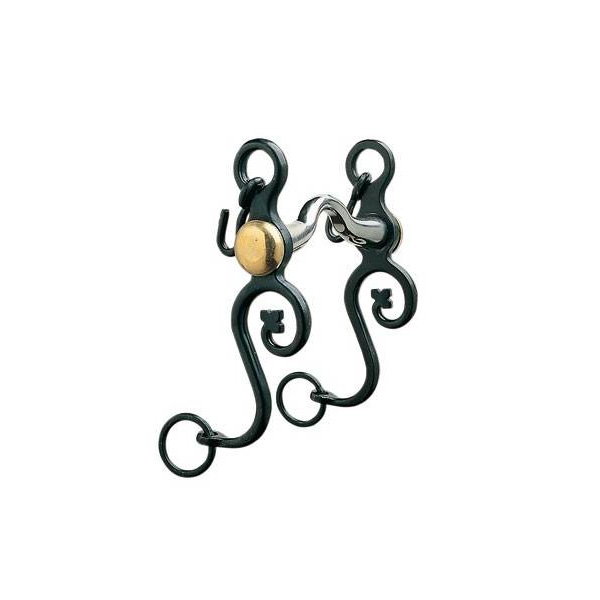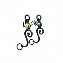 Шикарный мундштук в стиле вестерн с большими рельефными рычагами и крючками для цепочки чёрного цвета, золотистыми вставками по бокам грызла и самим грызлом из нержавеющей стали.Нет в наличии, ожидается поступление.