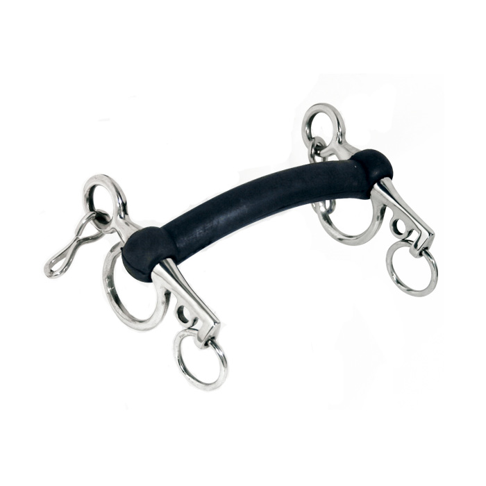 Пелям с резиновой "штангой", небольшими рычагами и крючками для цепочки. Такой вид железа обычно используется в конкуре и троеборье, рычаги усиливают воздействие на рот лошади, а резиновое покрытие грызла делает его более приятным для неё. Длина рычага 4 см.Нет в наличии, ожидается поступление.
