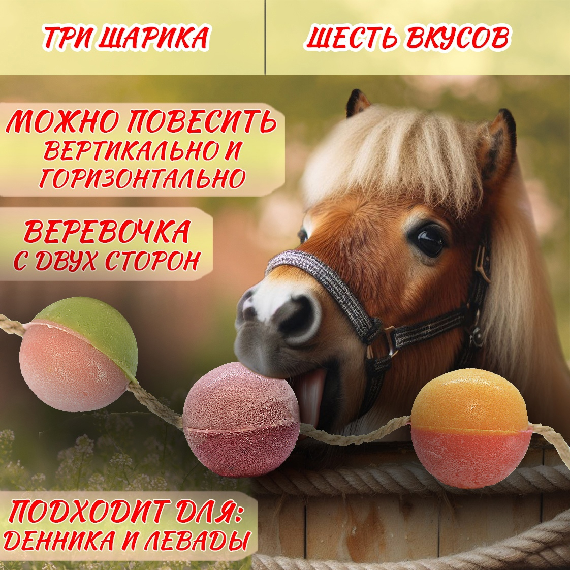 Тройное удовольствие для ваших любимцев! Три сладких шарика и ассорти вкусов! Подвесной ликит станет отличным развлечением для лошади в деннике, леваде и даже коневозе. Интерактивное лакомство избавляет от скуки, снимает стресс и помогает бороться с денниковыми пороками. Веревка для крепления в комплекте - шарики можно подвесить как горизонтально, так и вертикально.Перед посещением, уточняйте наличие товара в магазине