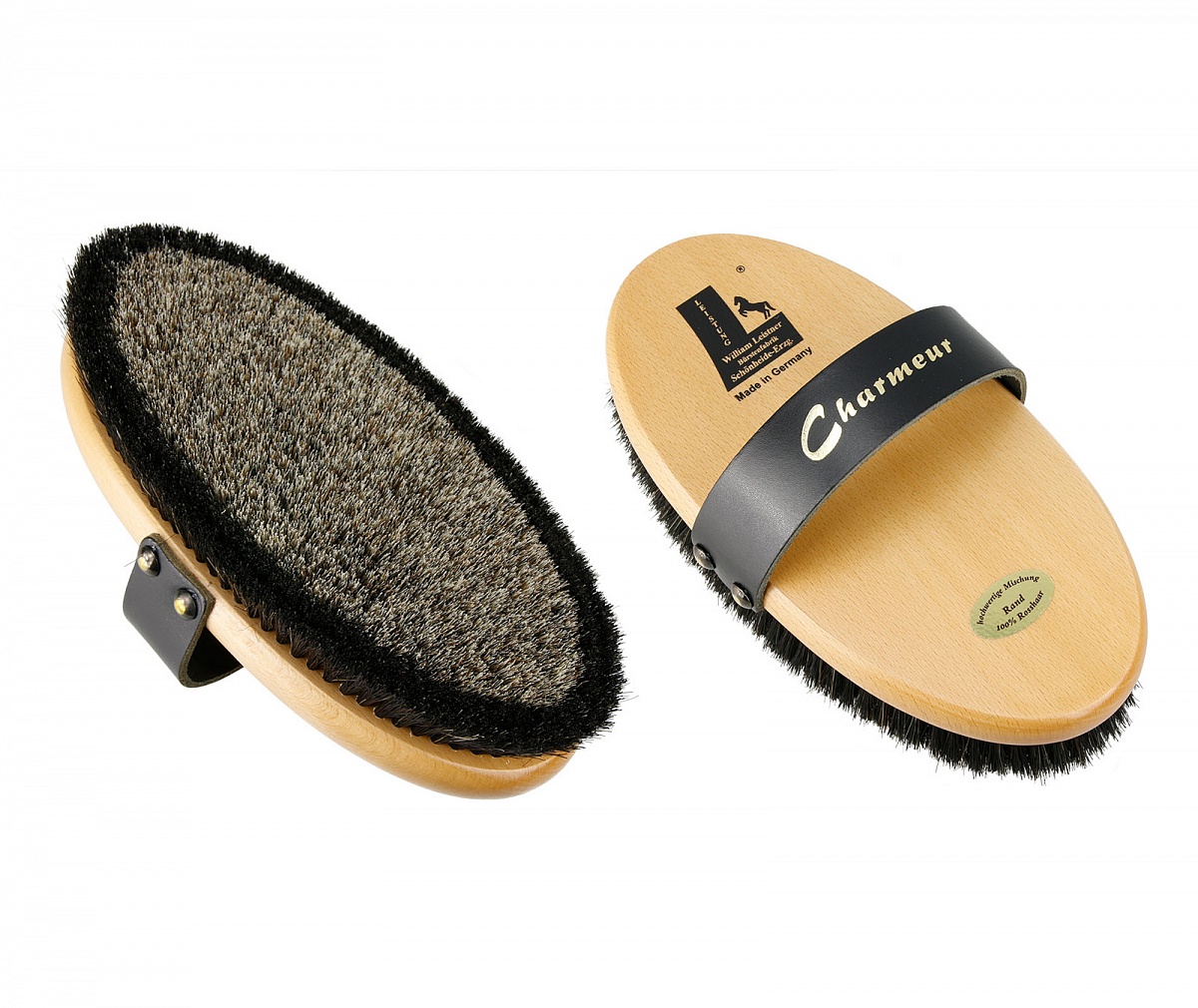 Деревянная щётка из бука с кожаной ручкой. Натуральная щетина из конского волоса отлично удаляет любую грязь, не пересушивает шерсть и не электризуется. Основание из лакированной древесины бука обладает антибактериальным эффектом и приятно ощущается в руке.Нет в наличии, ожидается поступление.